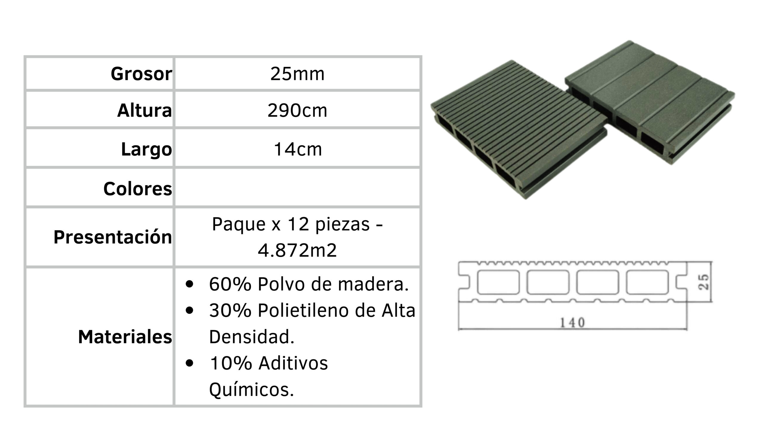 Piso dise帽ado para exteriores con un grosor de 25 mm, un largo de 290 cm y un ancho de 14 cm. Fabricado con una combinaci贸n de fibras de madera y pol铆meros de alta resistencia, este piso es impermeable, antideslizante y resistente a los rayos UV, ideal para terrazas, jardines y 谩reas al aire libre.